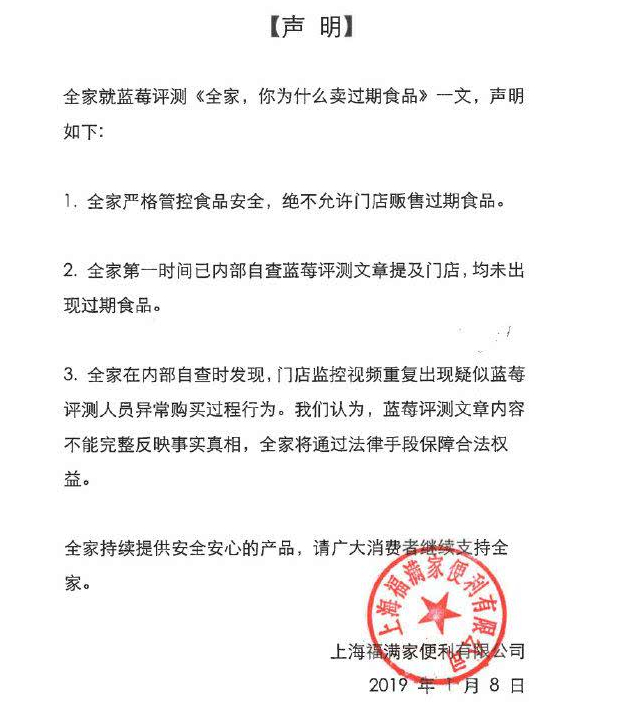 對此,全家發表聲明稱,首先全家嚴格管控食品安全,絕不允許門店販售過期食品;其次藍莓評測內容不能完整反映事實真相,全家將通過法律手段保障合法權益。