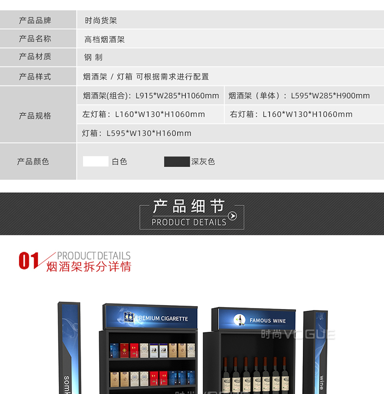 收銀臺紅酒架組合而成。便利店煙酒架立柱采用優質鋼材,具有很好的承重能力。頂部配有磁吸燈箱廣告牌,即可宣傳品牌,又可以指引顧客,讓整個收銀區的工作效率顯著提高。此款收銀區煙酒架是框架式結構,可以直接放置在收銀背柜上,穩定性和安全性很好。